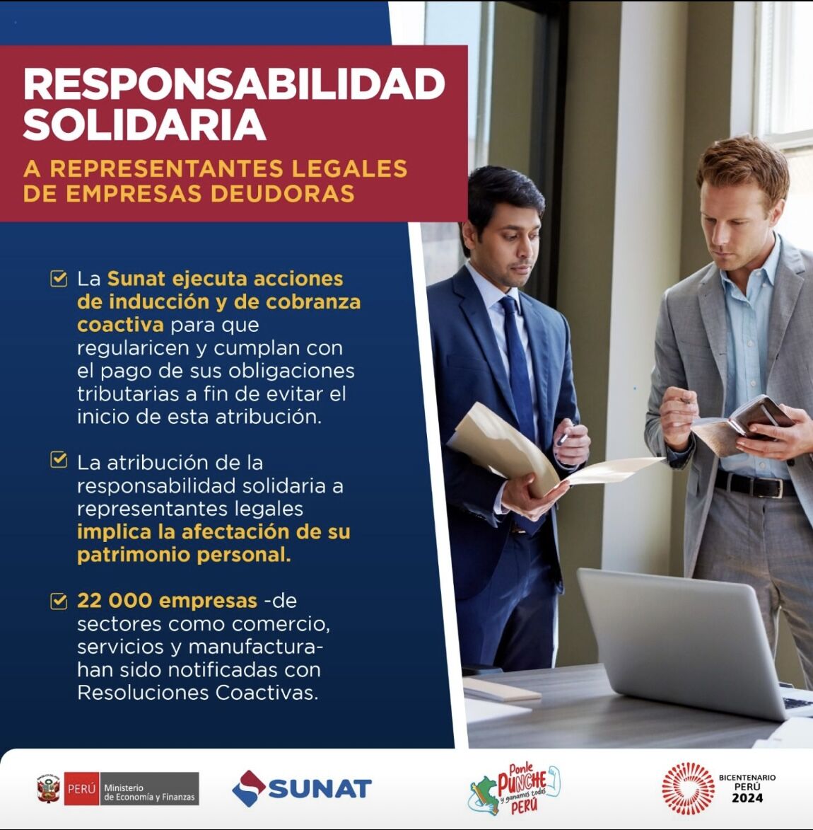 De la misma forma, SUNAT emite un comunicado diciendo que puede afectar el patrimonio personal de los representantes legales a menos que la empresa pague …. sin precisar que para ello el Código Tributario exige que el representante haya actuado con dolo, negligencia grave o abuso de facultades y que ese accionar sea causa de la omisión de pago de la empresa.